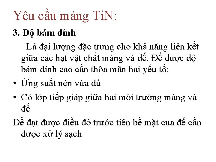 Yêu cầu màng Ti. N: 2. Độ cứng § Độ cứng là thước đo sức bền của vật liệu khi bị va chạm hay bị trầy xước § Độ cứng bản chất của màng Ti. N phụ thuộc vào áp suất riêng phần của Nitơ trong quá trình tạo màng, vì trong các hợp thức được tạo ra giữa nitơ và titan thì Ti. N là hợp thức có độ cứng cao nhất.