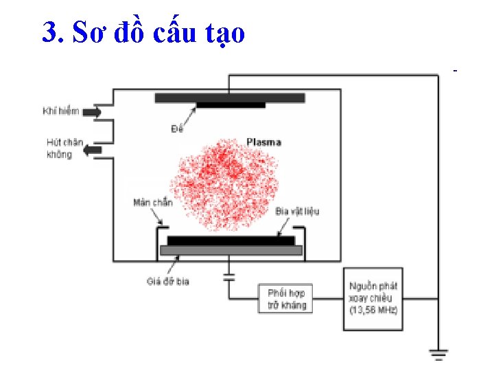 2. Phún xạ phóng điện xoay chiều (RF discharge sputtering) • Là kỹ thuật sử dụng hiệu điện thế xoay chiều để gia tốc cho iôn khí hiếm. Nó vẫn có cấu tạo chung của các hệ phún xạ, tuy nhiên máy phát là một máy phát cao tần sử dụng dòng điện tần số sóng vô tuyến (thường là 13, 56 MHz). • Vì dòng điện là xoay chiều, nên nó có thể sử dụng cho các bia vật liệu không dẫn điện.