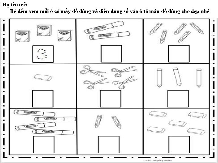Họ tên trẻ: Bé hãy tô màu ô số đúng với nhóm đồ dùng bên cạnh nhé