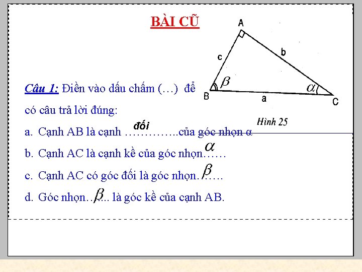 Câu 2: Trong những câu sau, câu nào đúng, câu nào sai (nếu sai hãy sửa lại cho đúng) Trong tam giác vuông, Mỗi cạnh góc vuông bằng: a. cạnh huyền nhân với sin góc kề S b. cạnh huyền nhân với cosin góc đối. S c. cạnh góc vuông kia nhân với tang góc đối Đ d. cạnh góc vuông kia nhân với côtang góc kề. Đ Câu 3: Tam giác vuông ABC với hai cạnh góc vuông là 8 cm và 6 cm. Cạnh huyền sẽ bằng: C a. 96 b. 100 c. 9 d. 10 8 A 6 B