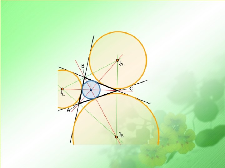 B 1. Định lí về hai tiếp tuyến cắt nhau AB, AC là các tiếp tuyến tại B và C của (O) A O 2. Đường tròn nội tiếp tam giác: * Khái niệm: Đường tròn tiếp xúc với ba cạnh của một tam giác gọi là đường tròn nội tiếp tam giác, còn tam giác gọi là ngoại tiếp đường tròn. * Tâm của đường tròn nội tiếp tam giác là giao điểm các đường phân giác các góc trong của tam giác. 3. Đường tròn bàng tiếp tam giác : * Khái niệm: Đường tròn tiếp xúc với một cạnh của một tam giác và tiếp xúc với các phần kéo dài của hai cạnh kia gọi là đường tròn bàng tiếp tam giác. * Tâm của đường tròn bàng tiếp tam giác là giao điểm của hai đường phân giác góc ngoài hoặc là giao điểm của một đường phân giác góc trong và một đường phân giác góc ngoài của tam giác. C