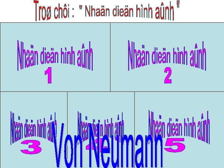 Luaät chôi nhö sau: Coù 5 caâu hoûi, baïn choïn caâu baát kyø. Neáu traû lôøi chính xaùc thì moät phaàn taám hình neàn seõ ñöôïc laät leân vaø traû lôøi cho ñeán caâu cuoái cuøng. Baïn haõy cho bieát hình neàn laø hình gì vaø noùi ñoâi ñieàu veà söï hieåu bieát cuûa baïn vôùi gôïi yù laø taám hình.