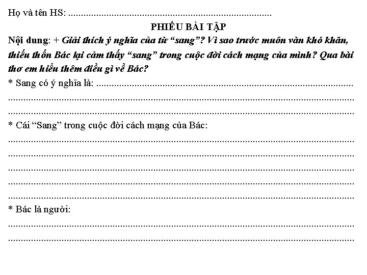 THẢO LUẬN NHÓM ĐÔI Nội dung: + Giải thích các ý nghĩa của từ “sang”? Vì sao trước muôn vàn khó khăn, thiếu thốn Bác lại cảm thấy “sang” trong cuộc đời cách mạng của mình? Qua bài thơ em hiểu thêm điều gì về Bác? - Hình thức: phiếu bài tập - Thời gian: 2’
