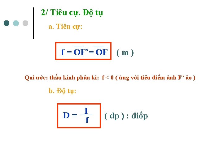 2. Tiêu cự. Độ tụ a. Tiêu cự : Tiêu cự: là khoảng cách từ quang tâm đến các tiêu điểm của thấu kính. f = OF’= OF (m) Qui ước: đối với thấu kính hội tụ: f > 0 , ứng với tiêu điểm ảnh F’ thật. b. Độ tụ: là đại lượng được đo bằng nghịch đảo tiêu cự. 1 D= f ( dp ) : điốp