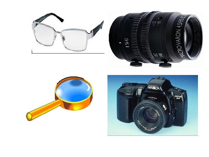 VI. Công dụng của thấu kính - Dùng để khắc phục tật của mắt (kính cận, kính viễn, kính lão). - Dùng để chế tạo kính lúp. - Làm vật kính của máy ảnh, máy ghi hình (camera). - Làm vật kính, thị kính của kính hiển vi, kính thiên văn, ống nhòm… - Ống nhòm. - Đèn chiếu. - Máy quang phổ.