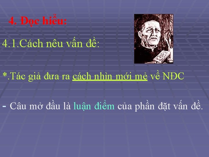 *. PVĐ vừa đặt vấn đề bằng cách chỉ ra định hướng tìm hiểu thơ văn NĐC vừa phê phán một số người chưa hiểu thơ NĐC, vừa khẳng định giá trị thơ văn yêu nước của ông. NX: Cách vào đề vừa phong phú, sâu sắc vừa thể hiện phương pháp NL khoa học của PVĐ.