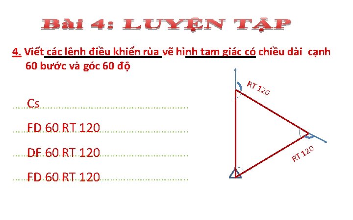 1. Viết lệnh viết tắt điều khiển rùa thực hiện các hành động sau: TT Hành động của Rùa Lệnh viết tắt 1 Tiến về trước n bước FD n 2 Lùi lại sau n bước 3 Quay phải k độ BK n RT k 4 Quay trái k độ 5 Nhấc bút (Rùa không vẽ nữa) LT k PU 6 Hạ bút (Rùa tiếp tục vẽ) PD 7 Về vị trí xuất phát, xóa toàn bộ sân chơi 8 Xóa màn hình, Rùa ở vị trí hiện tại 9 Rùa ẩn mình CS Clean HT 10 Rùa hiện hình 11 Về vị trí xuất phát ST Home 12 Thoát khỏi chương trình Logo Bye