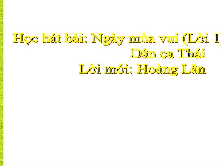 Ngµy mïa vui D©n ca: Th¸i. Lêi míi: Hoµng L©n Ngoài đồng lúa chín thơm. Nhịp nhàng những bước chân. Nô Ai nức trên đường vui thay gánh lúa về sân phơi Hội Ngày mùa rộn ràng quê mùa rộn ràng nơi Con Vang bõ nắng hương nơi ấm ấm có có chim hót trong vườn. ngân tiếng reo cười. công bao ngày mong chờ tươi cho màu thóc vàng no chan hoà yêu thương. đâu vui nào vui hơn.