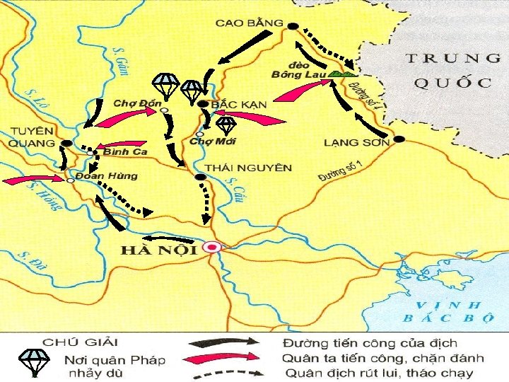 QU N ĐỊCH TẤN CÔNG QU N TA CHẶN ĐÁNH * Đường không: Binh đoàn quan dù nhảy dù xuống thị xã Bắc Kạn, chợ Mới, chợ Đồn. + Quân ta phục kích đánh tại chợ Mới, chợ Đồn. * Đường bộ: Từ Lạng Sơn bộ binh tấn công theo đường số 4 lên đèo Bông Lau, Cao Bằng rồi vòng xuống Bắc Kạn. * Đường thủy: Tàu chiến từ Hà Nội theo sông Hồng và sông Lô qua Đoan Hùng đánh lên Tuyên Quang. + Quân ta chặn đánh địch liên tục trên đường số 4 và giành thắng lợi lớn tại đèo Bông Lau. * Sau hơn 1 tháng bị sa lầy ở Việt Bắc quân giặc phải rút lui. + Trên đường thủy quân ta chặn đánh địch ở Đoan Hùng. Tàu chiến và ca nô của địch bị đốt cháy trên dòng sông Lô. + Đường rút quân của chúng cũng bị ta đánh dữ dội ở Bình Ca và Đoan Hùng. 11