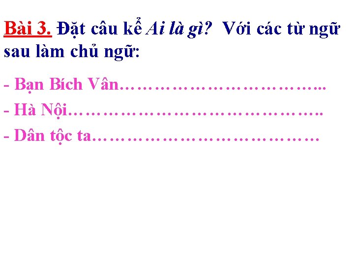 Bài 3. Đặt câu kể Ai là gì? Với các từ ngữ sau làm chủ ngữ: - Bạn Bích Vân là người Hà Nội. - Hà Nội là thủ đô của nước ta. - Dân tộc ta là dân tộc anh hùng.