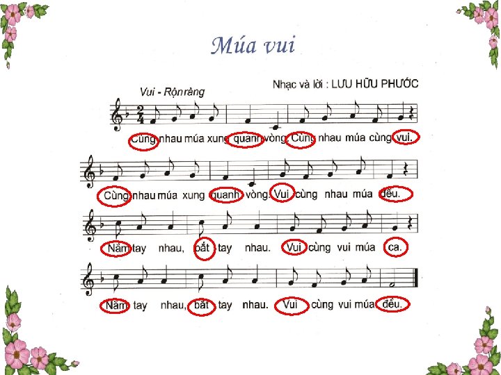 Thứ tư ngày 11 tháng 10 năm 2017 Tiết 6: Học hát bài Múa vui Nhạc và lời: Lưu Hữu Phước vòng xung quanh vòng Cùng nhau ……. Cùng nhau múa … cùngvui vòng Cùng nhau múa xung quanh…… múa đều Vui cùng nhau………. . Nắm tay nhau, … bắt tay nhau đều Vui cùng …… nhau múa …. . tay Nắm ……nhau, bắt tay nhau Vui cùng vui múa…. . đều