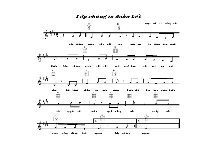Hát kết hợp gõ đệm theo Phách Lớp chúng mình rất vui. Anh em ta chan hòa tình thân. Lớp chúng x x x xx x mình rất vui. Như keo sơn anh em một nhà. Đầy tình thân quý mến x x x x x nhau Luôn thi đua học chăm tiến tới. Quyết kết đoàn giữ vững bền x x x x x Giúp đỡ nhau xứng đáng trò ngoan. Lớp chúng mình rất vui anh x xx x x em ta chan hòa tinh thân. Lớp chúng mình rất vui như keo sơn anh x x x x x em một nhà, đầy tình thân quý mến nhau, luôn thi đua học chăm tiến x x x x x tới quyết kết đoàn giữ vững bền giúp đỡ nhau xứng đáng trò ngoan. x x x xx