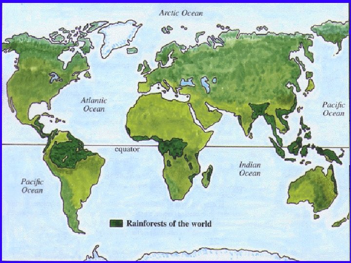 Climate • Tropical rainforests are always humid and warm • Get about 200 to 450 cm of rain a year • Located on a belt around the earth near the equator – They receive strong sunlight and maintain a relatively constant temperature year round • The tropical forest covers about 7% of Earth’s surface.