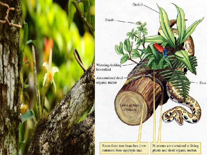 The Canopy • Trees form a dense layer that absorbs almost 95% of the sunlight • Split into an upper canopy and a lower canopy the lower canopy. • There are special plants that grow in this layer called epiphytes (ex. Orchids) – They grow on trees instead of the ground where they can get the sunlight needed for photosynthesis – These plants also absorb the water that runs down the tree branches when it rains • Most animals that live in the rainforest live in the canopy because they depend on these plants for survival