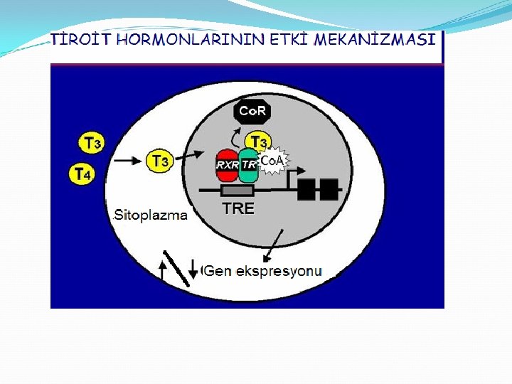 Tiroid hormonlarının reseptörleri Tiroid hormonlarının reseptörleri; hücre membranında, nukleusta ve mitokondri iç membranında bulunmaktadır. Na+/K+-ATPaz pompasını indüklerler. Tiroid hormon reseptörlerinin (TR) alt tipleri belirlenmiştir TRα 1, TRβ 1 ve TR β 2