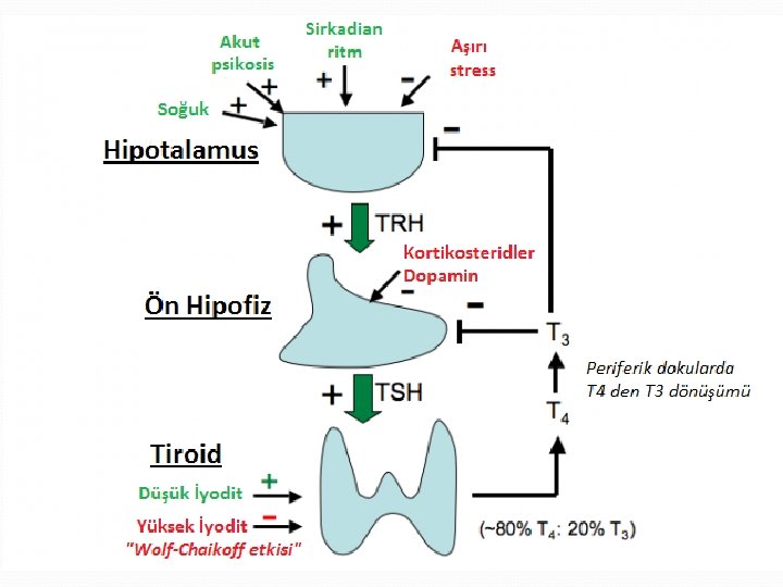 Tiroid hormonlarının salınımları Tiroid hormonlarının kana karışması TSH tarafından kontrol edilir. Dolaşımdaki tiroksinin bir kısmı 5 -deiyodinaz enzimi sayesinde bir iyodunu kaybederek T 3’e dönüşür. TSH salınımı TRH tarafından sağlanmaktadır. Burada esas düzenleyici ise tiroid hormonlarıdır. TRH aynı zamanda prolaktin salınımını da stimüle etmektedir.