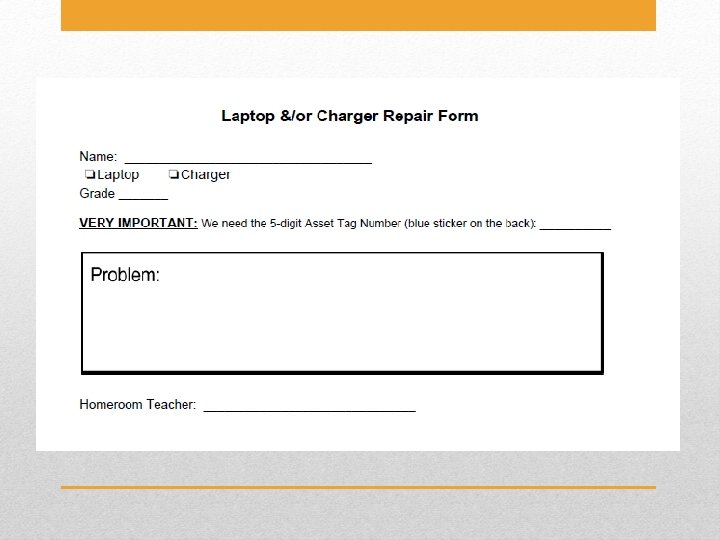 • Loaners are available in the morning: bring your laptop to the Library when the 8: 55 bell rings. • You may also bring your laptop in for repairs during Homeroom. Our Student Help Desk will be open in the Library. • If your laptop is turned in for repair, you can take a “loaner” home. • If you forgot your laptop at home, you will not be able to get a loaner for the school day! What if my laptop still won’t work?