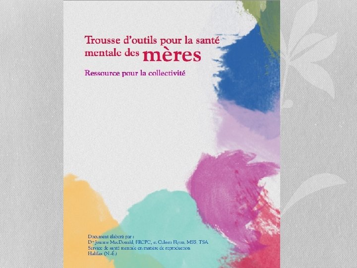 TROUSSE D’OUTILS POUR LA SANTÉ MENTALE DES MÈRES Un projet du Service pour la santé mentale en matière de reproduction Centre de santé IWK, Halifax (N. -É. ) Agence de la santé publique du Canada & Projets PACE/CPNP au Canada Une initiative de coopération communautaire