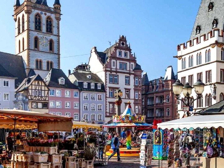 Trier - Hauptmarkt Trier (Trèves) obtint en 958 le droit de tenir marché. La place du Marché devint alors le cœur du Trier (Trèves) médiéval avec • La Steipe, la salle festive du conseil municipal et son accès mitoyen à l'église municipale de St Gangolf • la Fontaine St. Pierre (1595) • la Croix du Marché (érigée en 958 par l’archevêque Heinrich I) • l'accès à la cathédrale • l'accès au quartier juif • ainsi que l'accès à six rues