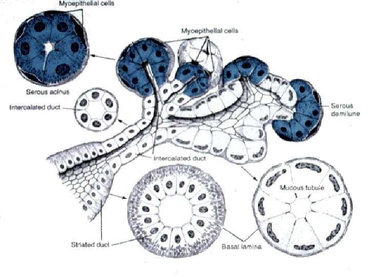 Sekreční oddíly slinných žláz • serózní acinus • mucin. tubulus • lunula (Gianuzzi)