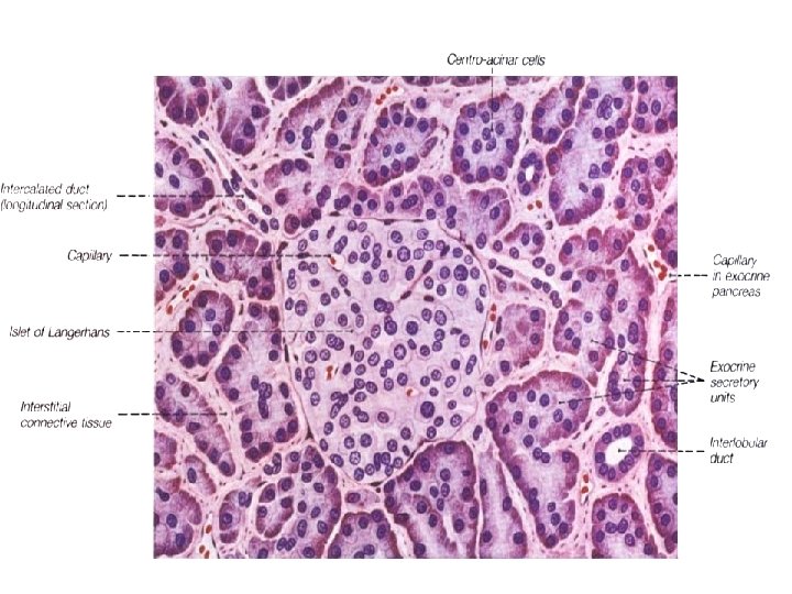Pancreas (Slinivka břišní) Vazivo (capsula fibrosa, septa) Parenchym: exokrinní žlázová tkáň: - serózní aciny + vývody vsunuté, intra- a interlobulární, hlavní (ductus pancreaticus major et accessorius) endokrinní žlázová tkáň : Langerhansovy ostrůvky - buňky A – glukagon, B – inzulin, D – somatostatin, PP – pankreatický polypeptid