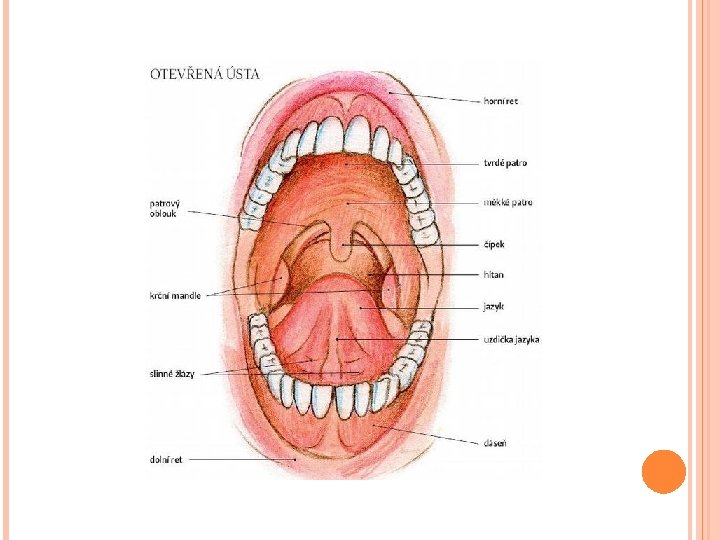 1. ČÁST TRÁVÍCÍ TRUBICE • • Jako první je DUTINA ÚSTNÍ (cavitas oris) : je přizpůsobena k příjímání potravy a jejímu rozmělňování Uplatňuje se také při fonaci, tvorbě hlásek a jako smyslový orgán Strop tvoří patro, spodinu svaly nadjazylkové (hl. spodinový sval ústní – m. mylohyoideus), přední stěnu tvoří rty se štěrbinou ústní, postranní stěny jsou tváře, zadní stěna chybí úžina hltanová – chřtán-