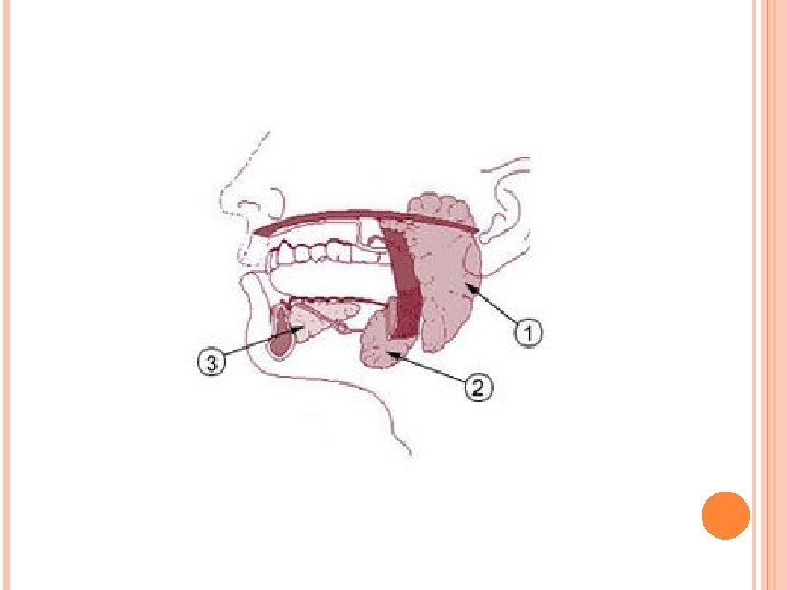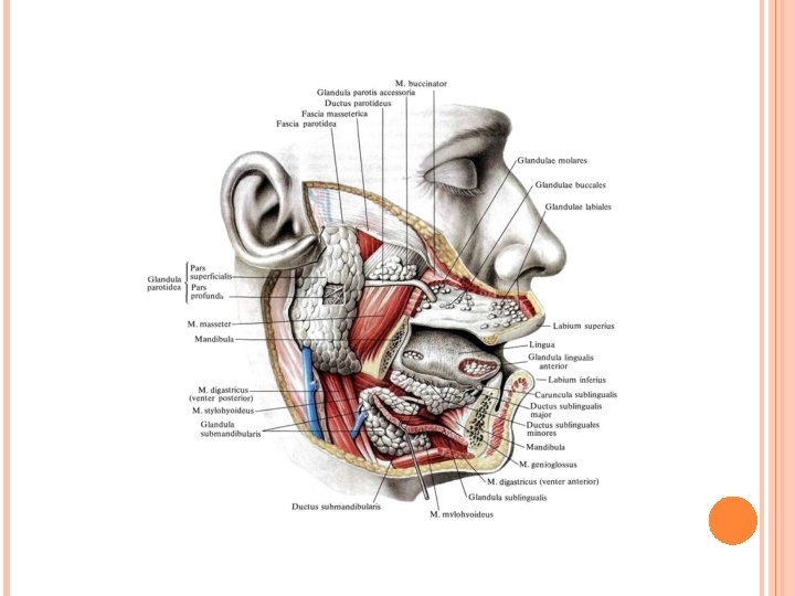 6 a)ŽLÁZY SLINNÉ(glandulae slaivariae) Uloženy ve sliznici rtů, tváří, patra, větší množství je v jazyku při hrotu i kořenu jazyka Hlavní 3 velké žlázy jsou podjazyková, podčelistní a příušní. Vměšují sliny na podněty čichové, sluchové či zrakové První dvě jsou uloženy na spodině ústní a vývody jsou pod hrotem jazyka Příušní(parotidea) je uložena na zevním svalu žvýkacím vývod ústí do předsíně ústní