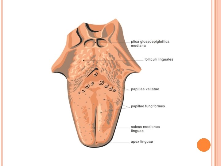 PAPILY na jazyce: nejvíce je nitkovitých papil, mezi němi jsou papily houbovité, na hranici těla a kořene jsou papily hrazené v jejích stěnách jsou chuťové pohárky org. Chuti V jazyku jsou ulož. také žlázky slinné, serózní(vodnatou slinu) , mucinózní(vazká hlenoviotá slina)