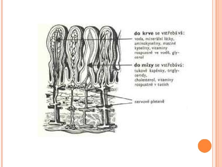 Žilka vycházející s klku vede krev do slizniční pleteně-dostává se do pleteně podslizniční-odtud do horní žily okružní-do žíly vrátnicové a do jater Mezi klky drobné tubulózní žlázky střevní ty produkují střev. šťávu a fermenty-erepsin štěpí peptidy na aminokyseliny, poté maltáza, sachráza, laktáta štěpící cukry na jednoduché hexózy Sliznice TS obsahuje velké množství shluků lymfocytů mizích uzlíčků, kterých přibývá směrem k vyústění TS do tlustého střeva