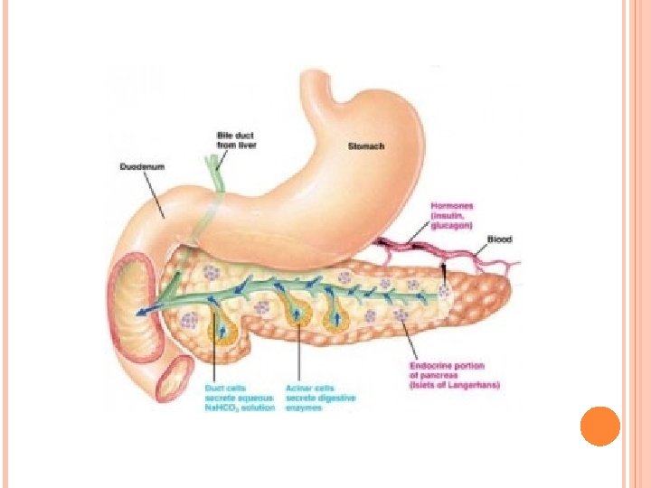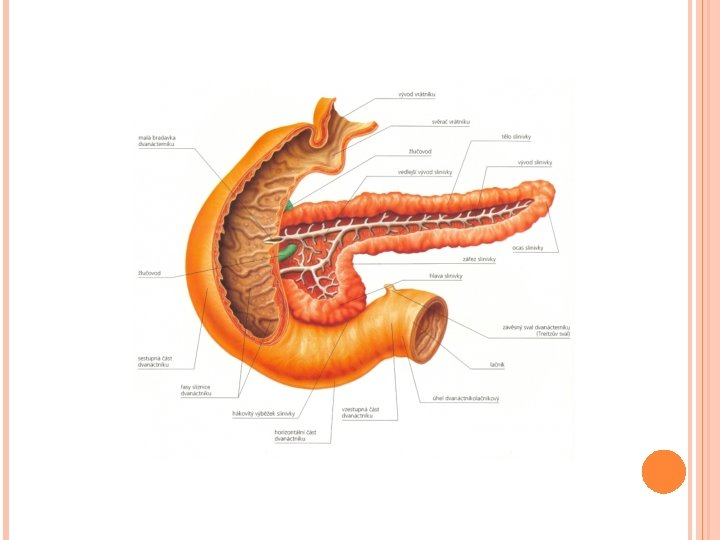 SLINIVKA BŘIŠNÍ(PANKREAS) Protáhlý útvar o délce 20 cm, m=80 g, uložena horizontálně, kříží páteř v úrovni L 2 a L 3 Narůžovělá barva, na povrchu zřetelné lalůčkovité struktury Rozeznáváme 3 části: hlavu(caput)uloženou v ohbí dvanáctníku, tělo(corpus)a ocas(cauda)míří ke slezině Uvnitř žlázy je uložen hlavní vývod pankratický, vyúsťující do duodena pomocí vaterské papily i se žlučovodem Sekretem je pankreatická šťáva, obsahue trypsin(bilkoviny), lipázu(tuky), maltázu a amylázu(gylcidy)