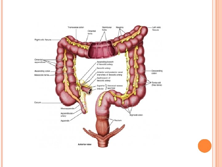 TLUSTÉ STŘEVO(INTESTINUM CRASSUM) Asi 150 cm dlouhé, tvoří čtyřhranný rámec v němž jsou uloženy kličky TS, Skládá se ze 6 částí: tlusté střevo, červovitý výběžek, tračník vzestupný, příčný, sestupný, esovitá klička, konečník Šířka tlustého střeva se udává na 5 cm Typický znak jsou 3 podélné pruhy na zevním povrchu střeva zvané pruhy tračníku se zbíhají na SS k červovitému výběžku, mezi teniemi je stěna vklenutá tzv. výpuky , haustra Další znak jsou bohaté výrůstky klků na zevní straně vyplněny tuk. vazivem
