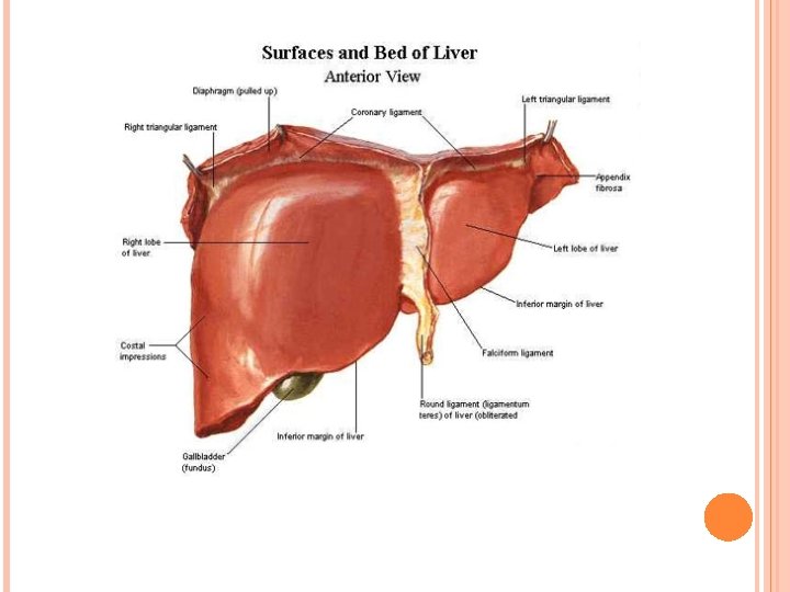JÁTRA(HEPAR) Uložená pod pravou klenbou bránice, váží zhruba 1, 5 kg, křehká, červenohnědé Horní plocha jater přiléhá ke klenbě bránice, spodní plocha nese otisky orgánů, na kterých leží : žaludek, dvanáctník, příčný tračník, pravé ledviny a nadledviny Jsou rozdělena na 2 laloky: vetší(pravý), menší(levý), hranice mezi oběma laloky je dobře patrná na spodní ploše v podobě nářezu Na spodní ploše PL jsou 2 jamky: 1)přední, dolní pro měchýř žlučový, 2)dolní a zadní pro dolní dutou žílu