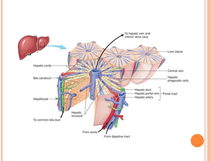 mezi zářezem mezilalokovým a oběma jamkami je branka jaterní(porta hepatis)z ní vystupuji žlučové vývody a přichází sem vrátnicová žíla a tepna jaterní Povrch jater kryje seróza, pobřišnice, která přechází z malého zakřivení na žaludku v podobě malé předstěry V pravém okraji malé předstěry ústí do jater žíla vrátnicová a tepna jaterní a vystupuje žlučovod Základní stavební jednotkou jat. parenychmu je jaterní lalůček, velký asi 1 mm, tavru šestibokého hranolku Každý lalůček se skládá z mnoha trámců pater bb. , které se radiálně zbíhají do středu Každý trámec je tvořen dvěma řadami bb , mezi nimiž zůstává uzoučký kanálek-žlučová kapilára-do něho vylučují jaterní bb žluč