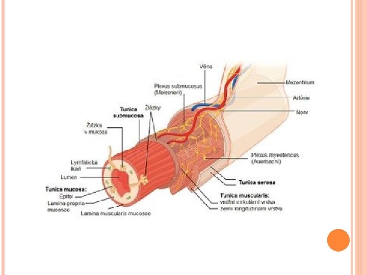 V dalších pasážích jednovrstevný cylindrický (resorpce živin) = hladký, místy zřasený = KLKY(vili, villus) – místa, která zvětšují povrch střev pro vstřebávání Musí spolehlivě bránit proti pronikáním bakterií, nevstřebatelných látek a pod. 2)PODSLIZNIČNÍ VAZIVO(submucosa) Tvoří širší vrstvu trubice trávicí bohatou na pleteně cévní a nervové (Messinerova pleteň) Dovoluje posouvání sliznice proti spodině