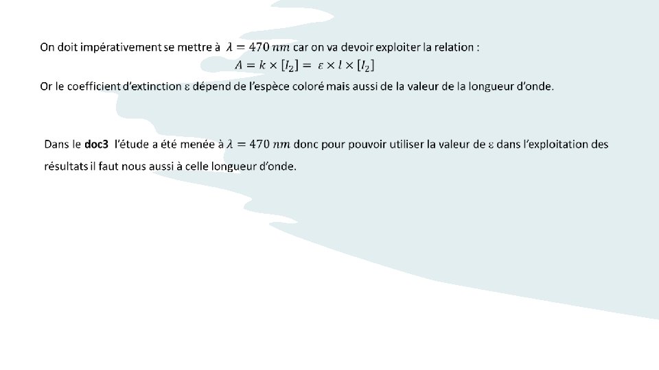 Doc 2 : Spectre d’absorption d’une solution de diiode en fonction de la longueur d’onde A 2, 5 2 R 2 = 0, 9983 1, 5 1 0, 5 0 0, 00 E+00 1, 00 E-03 2, 00 E-03 3, 00 E-03 4, 00 E-03 5, 00 E-03 6, 00 E-03 [I 2] mol/L