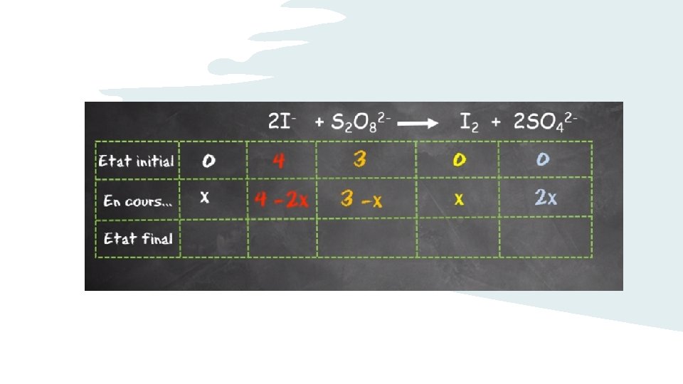Équation de la réaction état initial 0 à t = 0 (mol) au cours de la transformation à une date t (mol) état final à t = (mol) Bilan état final 0 0