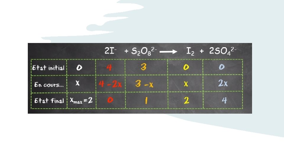 la réaction est totale si avancement final est égal à l’avancement maximum Calculer le xmax théorique et le comparer au xfinal Conditions initiales + tableau avancement