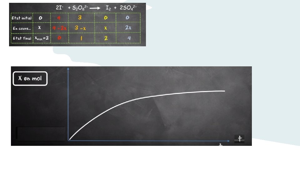 Equation (CH 3)3 C−Cl + 2 H 2 O = (CH 3)3 C−OH + H 3 O+ + Cl − État initial (mol) 0 9, 2. 10 -3 excès 0 ≈0 0 État à l’instant t X 9, 2. 10 -3− x excès x x x État final à t = ∞ x = xmax 9, 2. 10 -3 − xmax≈ 0 excès xmax =9, 2. 10 -3 xmax = 9, 2. 10 -3 Donc l’évolution de = f(t) est le reflet de x =f(t)