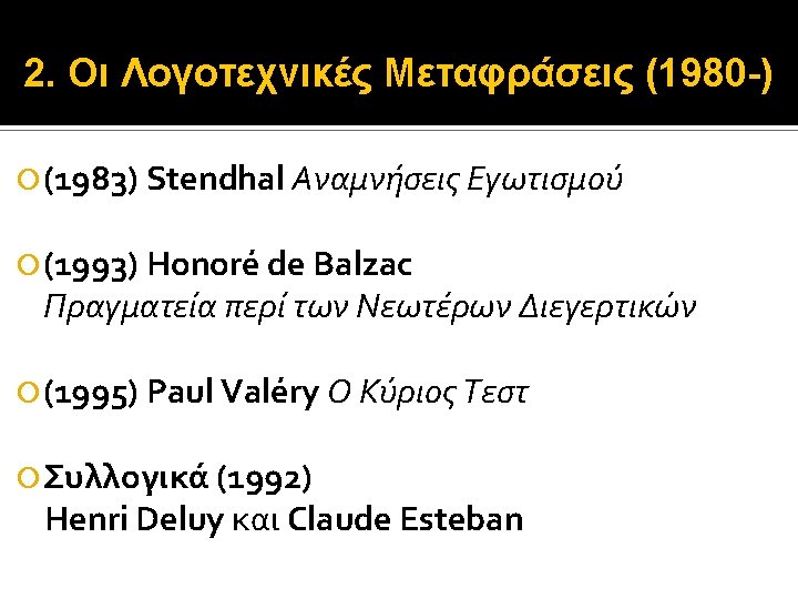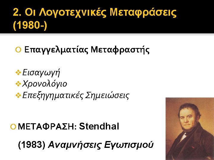 2. Οι Λογοτεχνικές Μεταφράσεις (1980 -) Stendhal (1783 -1842) (1890) La Vie de Henry Brulard – 1835 -36
