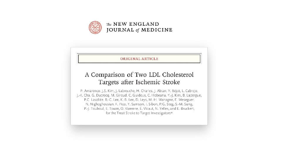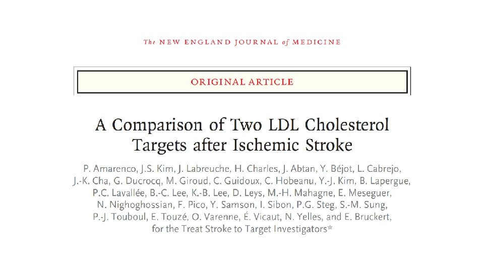 TST Conclusions • With the limitation that we had to stop the trial when 277 primary endpoints were accrued whereas 385 were requested • This trial shows that after an ischemic stroke with evidence of atherosclerosis, a target LDL cholesterol of less than 70 mg/d. L (1. 8 mmol/L) compared to 100± 10 mg/d. L (2. 5 mmol/L), reduced the risk of subsequent cardiovascular events • With no significant increase in intracranial hemorrhage • And no increase in newly diagnosed diabetes