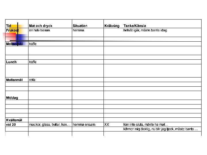Livsregler - frågor n n n Jag måste vara andra till lags för att inte bli övergiven Man måste vara smal för att bli omtyckt/ha ngt värde Om jag inte alltid har kontroll över allting så har jag ingen koll alls n n Hur har regeln hittills styrt ditt liv? Når du dina mål? Kan du omformulera? Kan du prova nytt förhållningssätt, nytt beteende?
