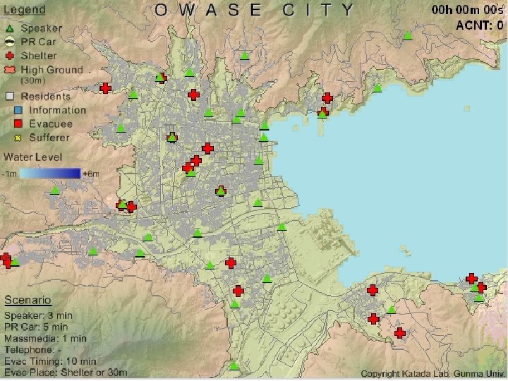 Setting of Basic Condition o Input the information facilities and evacuation facilities Households: 6, 651 Loudspeakers: 35 Patrol Cars: 4 Shelters: 25 Loudspeaker Refuge Place Patrol Car Route Road Network High Ground (30 m)