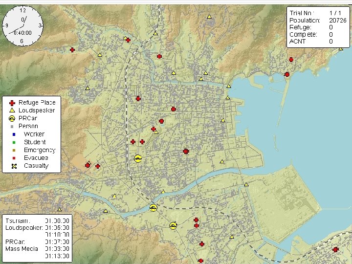 Tsunami Scenario Simulator o Integration of 1. 2. 3. Warning Transmission Simulation Evacuation Simulation Tsunami Simulation o Estimation of the casualties o Visualization in the GIS Framework