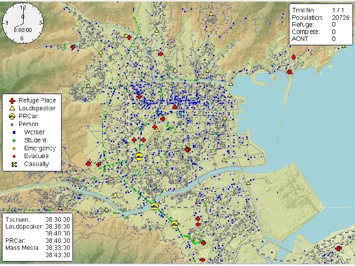 Changes in the simulation concept o Old Simulation: Stopwatch Model n n o The previous simulation can be called a “stopwatch” model because the simulation commenced at the event of earthquake. This model doesn't consider the timing of the earthquake. New Simulation: Clock Model n The new simulation model can handle the situation which the disaster occurs at arbitrary time. o n How much the damage will be if the earthquake strikes at 9 am and the tsunami attack at 9: 20 am? Advantages of Clock Model o o o This model can keep track the behavior of each individual. This model can estimate the damage that changes by the occurrence time of the disaster. This model can include the interactions of all the simulations (evacuation, warning-transmission, and tsunami-runup).
