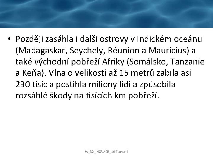 • Později zasáhla i další ostrovy v Indickém oceánu (Madagaskar, Seychely, Réunion a Mauricius) a také východní pobřeží Afriky (Somálsko, Tanzanie a Keňa). Vlna o velikosti až 15 metrů zabila asi 230 tisíc a postihla miliony lidí a způsobila rozsáhlé škody na tisících km pobřeží. VY_32_INOVACE_ 10 Tsunami