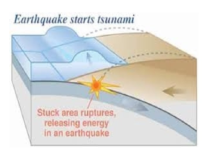 • Energy accumulates in the overriding plate until it exceeds the frictional forces between the two stuck plates. When this happens, the overriding plate snaps back into an unrestrained position. • This sudden motion is the cause of the tsunami because it gives an enormous shove to the overlying water. At the same time, inland areas of the overriding plate are suddenly lowered.