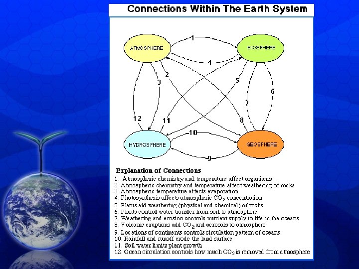 • TSW Differentiate and show interactions among the geosphere, hydrosphere, cryosphere, atmosphere, and biosphere.