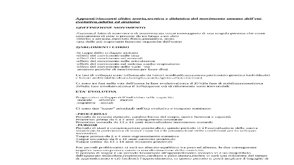 TTD Attività motoria in età evolutiva, adulta e anziana - terza lezione • • • Età evolutiva: Comprende i seguenti periodi significativi: - Fase pre-natale: da -9 a 0 mesi - Fase neo-natale: da 0 a 18 mesi - Fase prima infanzia: 18 mesi – 3 anni - Fase seconda infanzia: 3 a 5 anni - Fase fanciullezza: da 5 a 7 anni - Fase fanciullezza II: da 8 a 11 anni - Pubertà: da 11 a 14 anni - Adolescenza: da 14 a 18 anni