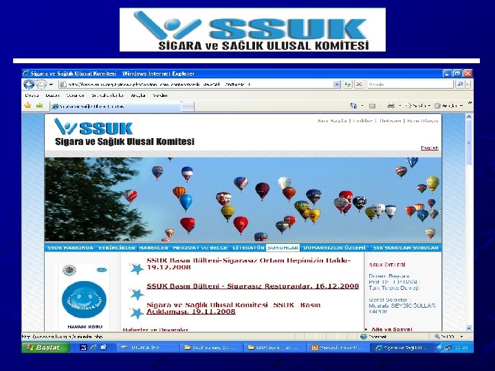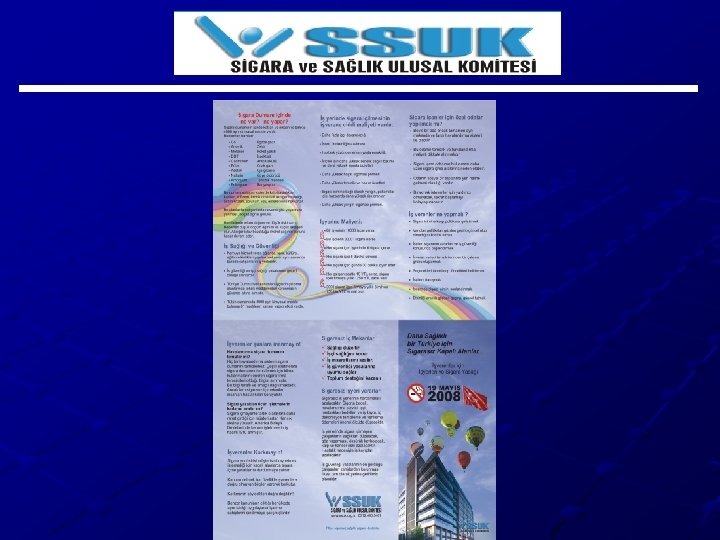 SSUK ETKİNLİKLERİ 2008 YILI: Basın Bültenleri: 04/01/2008, 4207 Sayılı Kanunun TBMM’de Kabulü 28/05/2008, SSUK’ tan Türk halkına çağrı: Sigara yasağına uy, uymayanları uyar! 28/06/2008, Sigara Yasağı Ertelenemez! Vatandaşın Sağlığı Ticari Kardan Önemlidir! 19/11/2008, 4207 Sayılı Kanun ve Tam Sigarasız İç Ortamlar 16/12/2008, Sigarasız Restoranlar 19/12/2008, Sigarasız Ortamlar Hepimizin Hakkı