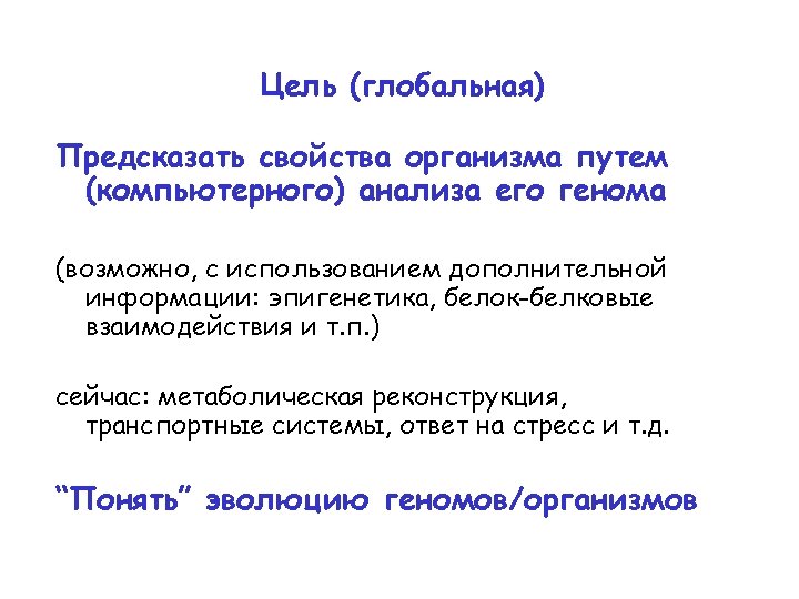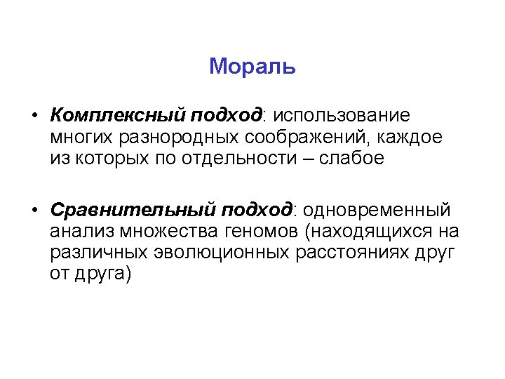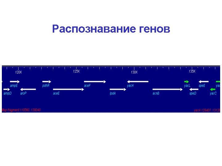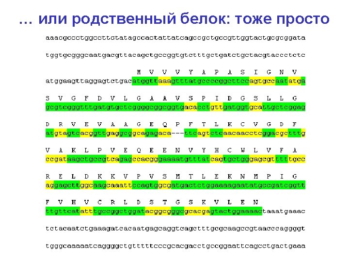 Сравнительный анализ (один и тот же ген в нескольких геномах) Гены консервативнее, чем межгенные области (точнее, особенности эволюции другие) Sty TCGCTCG--CAGCGGAAAGAGGATTACGCCCTTCGCCTGGAGGCTGTGCAGGGGC---GCCGGAGATGGGATGCATAATT Stm TCGCTCG--CAGCGGAAAGAGGATTACGCCCTTCGCCTGGAGGCTGTGCAGGGGC---GCCGGAGATGGGATGCATAATT Sen TCGCTCG--CAGCGGAAAGAGGATTACGCCCTTCGCCTGGAGGCTGTGCAGGGGC---GCCGGAGATGGGATGCATAATT Eco TTGCCCG--TGCCAGACGGCAGATTATCTCCCTGACCTGGTGGTTGCCCAGGAGGAGGGCCGGAAATAGGTTGTATCATT Kpn ----CGG--TGGCGCAGTGCCTGATGGG-CCTCGCCCTGGAGGACGGTCTGGCAT---ATCAGCAAGGGGGTGCGTCATG Ype TTGTTAGAACAGGGGAAAACGGTAAACAGTGTGGCATTAGATGTCGGTTATAGCT-----CCGCCTCTGCTTTTATCGCC * * * * * * * Sty AATTATCCTTTAAC-----CATAAATCTGAGCAATA-TATGCTTGGCGGCCAGATTATGGC--ACACTTGTCCGG Stm AATTATCCTTTAAC-----CATAAATCTGAGCAATA-TATGCCTGGCGGCCAGATTATGGC--ACACTTGTCCGG Sen AATTATCCTTTAAC-----CATAAATCTGAGCAATA-TATGCCTGGCGGCCAGATTATGGC--ACACTTGTCCGG Eco ACGTATCCTTATAC-----CTGAAATCTTCGCAAG--TATGCCTGGCCGCGAGATTATGGC--ACACTTGTCCGG Kpn ATTCATCCTTTCGATATCGCGGTGCTGGAACCAGGTGATGAGTATGCCTGGCGGCCAGATTATGGC--ACACTTCCCCAG Ype ATGTTTCAGCAAATAT----CGGGTACCA-CGCCTGAGCGTTTCCGGCGGGGCAATAGTGGCTTATACTAAGCCCC * ** * * *** * ** **** * *** Sty TTAACTCTCGTT-CTCAAACAG------GTACGACAGTC--GTGAAAATTCTCGTTGATGAAAATATGCCTTACGCCCGC Stm TTAACTCTCGTT-CTCAAACAG------GTACGACAGTC--GTGAAAATTCTCGTTGATGAAAATATGCCTTACGCCCGC Sen TTAACTCTCGTT-CTCAAACAG------GTACGACAGTC--GTGAAAATTCTCGTTGATGAAAATATGCCTTACGCCCGC Eco TTAACTCTCGT--CTCATACAG------GTAACACAAAC--GTGAAAATCCTTGTTGATGAAAATATGCCTTATGCCCGC Kpn TTAACTCTCGTT-CTCAGACAG------GTACTGAACT---GTGAAAATCCTCGTTGATGAAAATATGCCCGT Ype CTGTTTTTCATCTGTATGGCAGTTCGCTGTCGGAGAGTAAAGTGAAAATTCTGGTTGATGAAAATATGCCGTACGCTGAG * * ** * * *** **** ** ********* ** ** 123123123123123123123